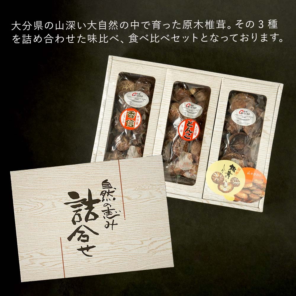 大分県の山深い大自然の中で育った原木椎茸。その3種を詰め合わせた味比べ、食べ比べセットとなっております。