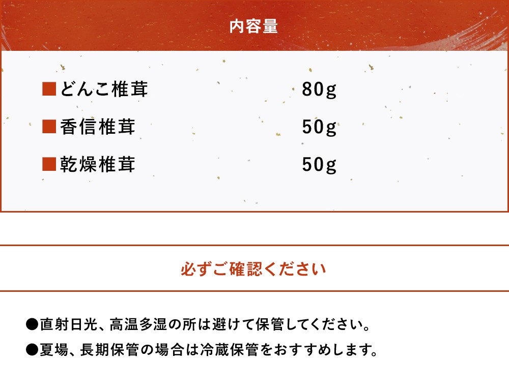| 容量 | 大分県産原木どんこ椎茸 80g 大分県産原木香信椎茸 50g 大分県産原木椎茸 50g |