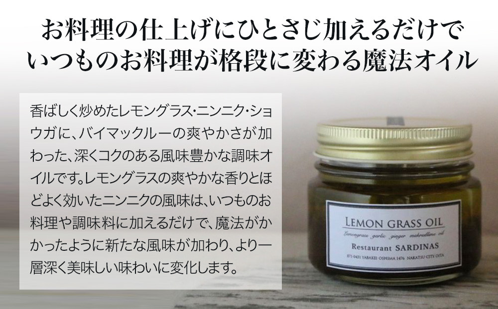 チョイスPayポイントと交換できる品 オーガニック中心に厳選した材料を使って作られた、人気の自家製調味料セットです。 レストランサルディナスギフトボックス(レモングラスオイル・フレーク塩) | エスニック 自家製調味料 オリーブオイル レモングラス オイル 塩 しお シオ フレーク 塩 ふれーく 天然塩 大分県産 九州産 大分県 中津市