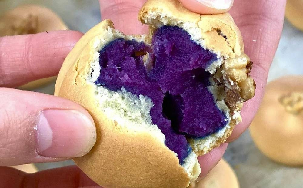 発酵バターや練乳、卵を混ぜ込んだ紫芋あんを、ビスケット生地で包んだ洋風饅頭です。