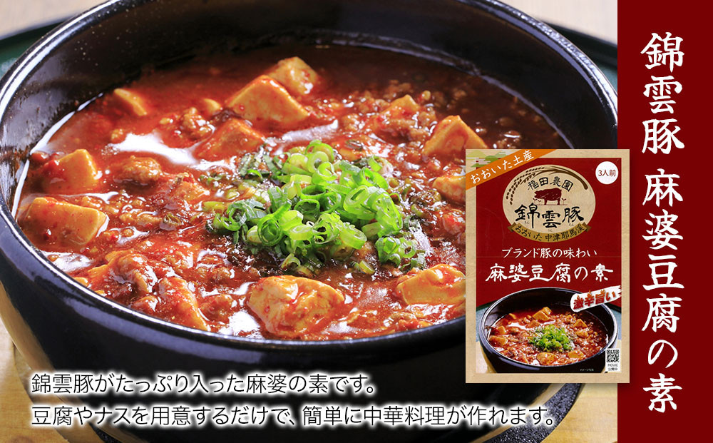錦雲豚がたっぷり入った麻婆の素です。豆腐やナスを用意するだけで、簡単に中華料理が作れます。