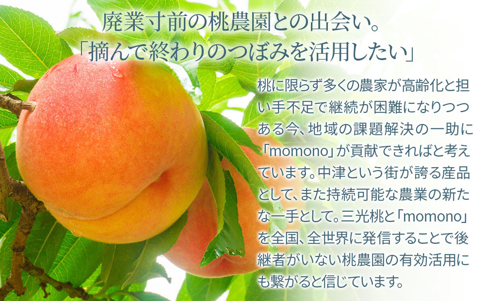 中津という街が誇る産品として、また持続可能な農業の新たな一手として。三光桃と「momono」を全国、全世界に発信することで後継者がいない桃農園の有効活用にも繋がると信じています。