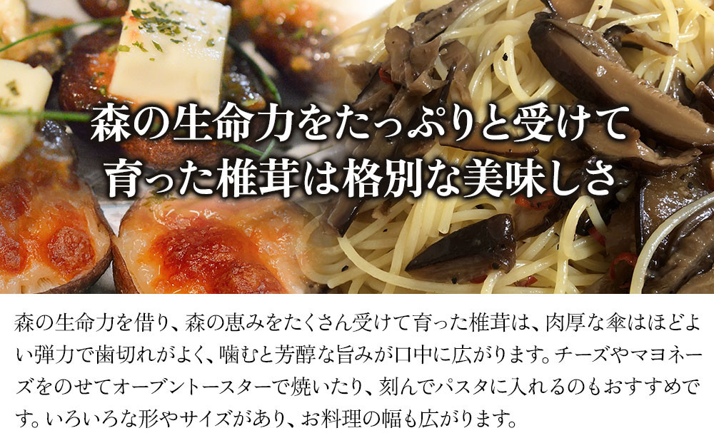 森の生命力を借り、森の恵みをたくさん受けて育った椎茸は、肉厚な傘はほどよい弾力で歯切れがよく、噛むと芳醇な旨みが口中に広がります。チーズやマヨネーズをのせてオーブントースターで焼いたり、刻んでパスタに入れるのもおすすめです。いろいろな形やサイズがあり、お料理の幅も広がります。
