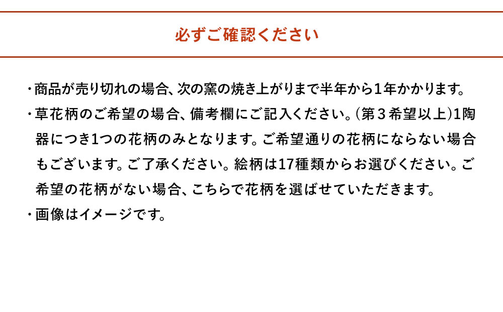 ・草花柄のご希望の場合、備考欄にご記入ください。(第3希望以上)1陶器につき1つの花柄のみとなります。ご希望通りの花柄にならない場合もございます。ご了承ください。絵柄は17種類からお選びください。ご希望の花柄がない場合、こちらで花柄を選ばせていただきます。