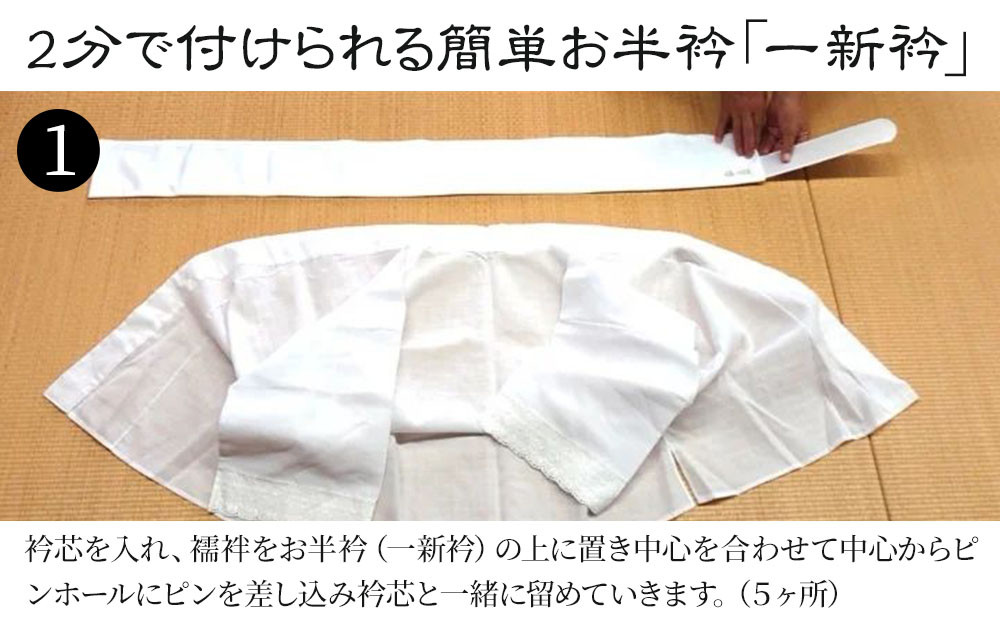「一新衿」を使うことで、衿を汗や汚れから守ります。また、衿が傷んで着れなくなった衣を包み込むことで、綺麗な状態を保つことができます。2分で付けられる簡単お半衿「一新衿」です。