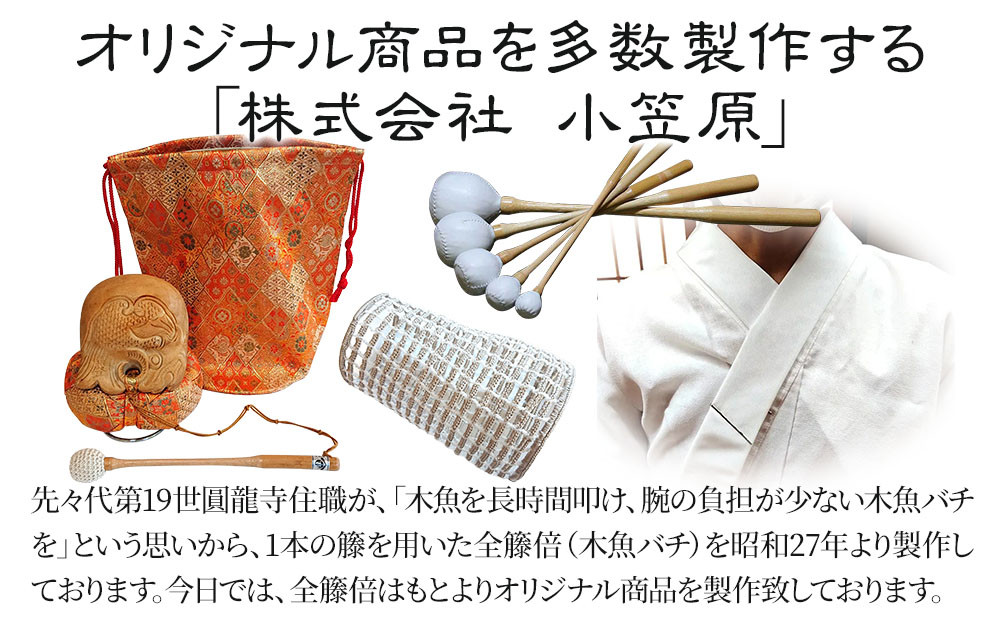 先々代第19世圓龍寺住職が考案した1本の籐を用いた全籐倍(木魚バチ)です。