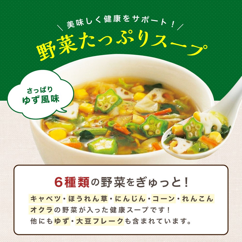 キャベツ・ほうれん草・にんじん・コーン・れんこん・オクラの6種類の野菜とゆず・大豆フレークが入った、具沢山なゆず風味の和風スープです。