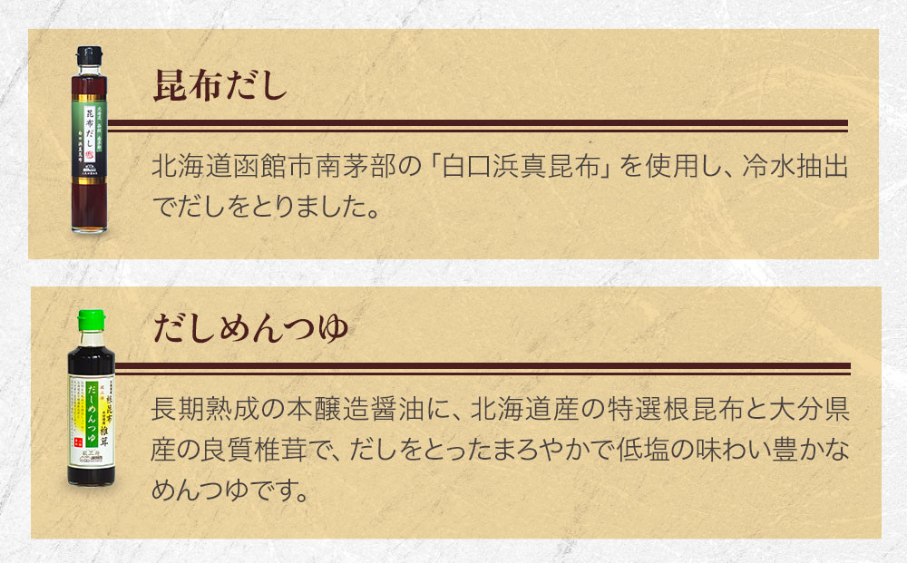 長期熟成の本醸造醤油に、北海道産の特選根昆布と大分県産の良質椎茸で、だしをとったまろやかで低塩の味わい豊かなめんつゆです。