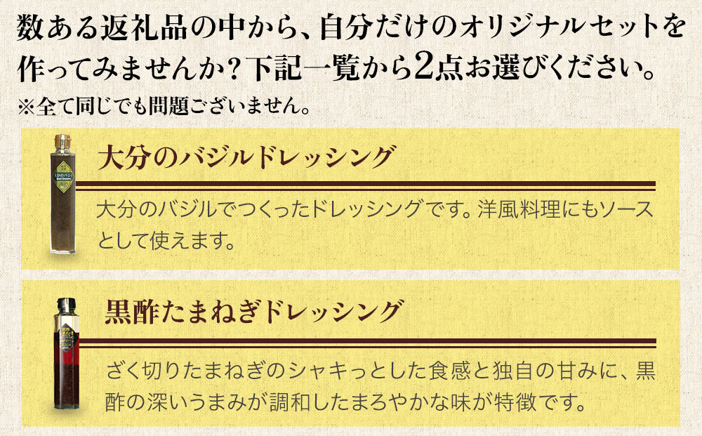 チョイスPayポイントと交換できる品 数ある返礼品の中から、自分だけのオリジナルセットが作れます。 蔵工房・二反田醤油 B1.お選び 2点セット | 調味料 ドレッシング バジル 黒酢玉ねぎ バルサミコ 胡麻 かぼす ゆず 白ぶどう ビネガーノンオイル 選べる 2点 セット 九州産 大分県 中津市