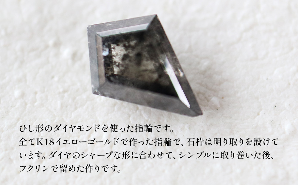 全てK18イエローゴールドで作った指輪で、石枠は明り取りを設けています。ダイヤのシャープな形に合わせて、シンプルに取り巻いた後、フクリンで留めた作りです。