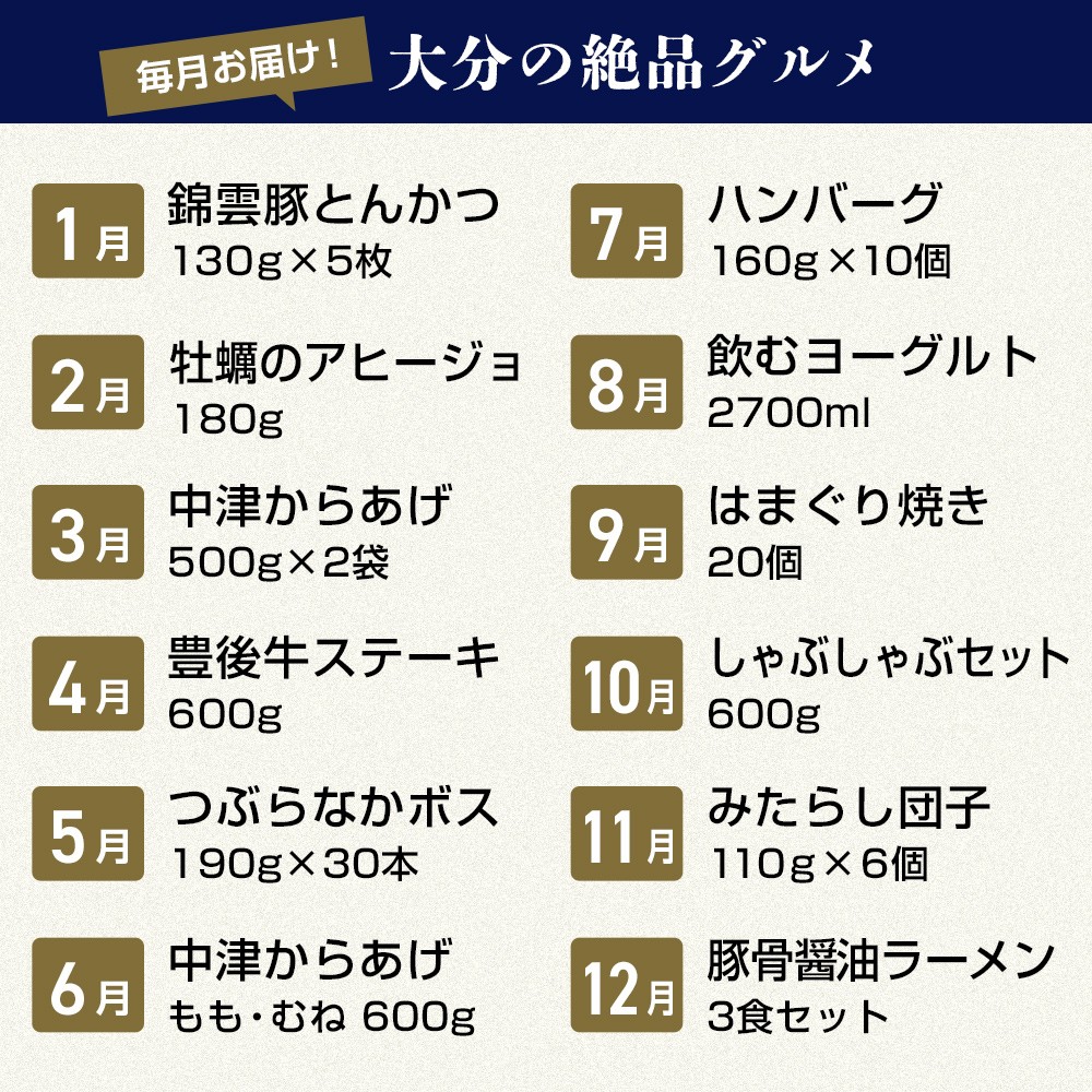 チョイスPayポイントと交換できる品 中津市の特産品を1年間楽しめる定期便です! 大分県 決定版 定期便 【 12 回 】 | お肉 肉 豚 豚肉 錦雲豚 とんかつ トンカツ 牡蠣 アヒージョ 中津からあげ からあげ 唐揚げ 牛肉 豊後牛 ステーキ かぼす つぶらなカボス 若鶏 鶏肉 ハンバーグ 飲むヨーグルト ヨーグルト はまぐり焼 しゃぶしゃぶ みたらしだんご みたらし団子 団子 ラーメン 拉麺 麺類 定期 大分県 中津市 訳あり オススメ 人気 特産品