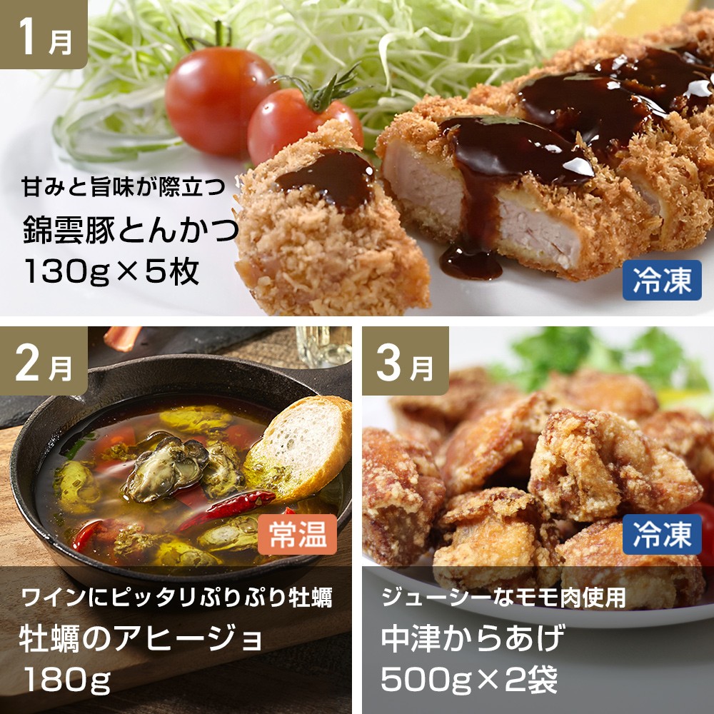 | 消費期限 | 【1月】錦雲豚 とんかつ5枚セット:加工日より30日 【2月】牡蠣のアヒージョ:別途商品ラベルに記載 【3月】中津からあげ 骨なしもも肉【生タイプ】:到着後冷凍保存で3ヶ月 【4月】豊後牛 サーロインステーキ:【要冷凍】30日 【5月】つぶらなカボス:製造日より19ケ月 【6月】鳥しん 若鶏からあげ もも肉・むね肉:お届けから約3ヶ月(商品に表記あり) 【7月】大分の恵みハンバーグ:製造より1年間(別途商品ラベルに記載) 【8月】飲むヨーグルトS-1:製造から14日(商品フタに記載) 【9月】はまぐり焼 (菓子):15日程度<br> 【10月】錦雲豚 しゃぶしゃぶギフトセット:加工日より30日 【11月】みたらしだんご:製造から21日程度 【12月】生ラーメン:製造より7日間 |