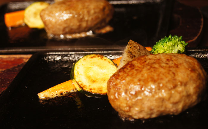 九州産の上選牛と特選牛の切り落としを使用した100%和牛の贅沢なハンバーグで、カットすると肉汁が溢れでてくる、和牛の肉本来のを味を贅沢に味わえます。