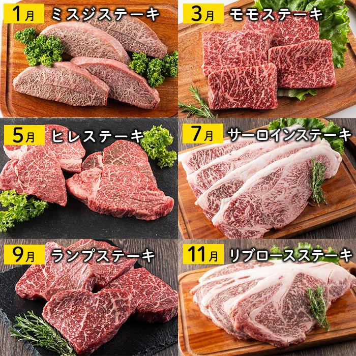 | 容量 | ・1月:ミスジステーキ:100g×4枚 ・3月:モモステーキ:100g×4枚 ・5月:ヒレステーキ:100g×4枚 ・7月:サーロインステーキ:200g×4枚 ・9月:ランプステーキ:100g×4枚 ・11月:リブロースステーキ:250g×4枚 ※各月ともステーキソース20g×4袋を一緒にお届けします。 6回配送(各該当月) |