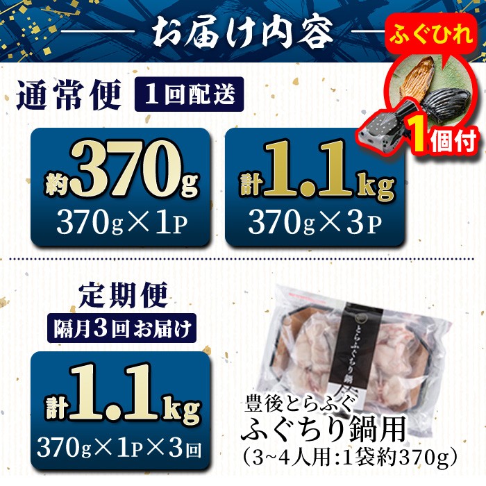 チョイスPayポイントと交換できる品 簡単調理!お好みの野菜を用意していただければすぐに召し上がれます。 【期間限定・ふぐひれ付】豊後とらふぐ ふぐちり鍋用 (約 370g ・計 1.1kg ・全3回隔月総量 1.1kg) 内容量・お届け回数が選べる!フグ 鍋 ふぐちり 冷凍 海鮮 定期便 【AB65-G・AB225-G・AB226-G】【柳井商店】