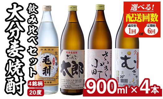 チョイスPayポイントと交換できる品 ストレート、ロック、焼酎ハイボールなど楽しみ方色々!カボスとの相性も抜群! <お届け回数が選べる> 大分麦焼酎飲み比べセット (900ml×4本/全6回連続・総量24本) 寄付額改定 定期便 焼酎 麦焼酎 焼酎セット 900ml 毛利 ぶんご太郎 さいき小町 むぎゅ ご当地 焼酎 麦 糖質ゼロ 20度 セット 4本 酒 アルコール【AN95・AN107】【ぶんご銘醸】