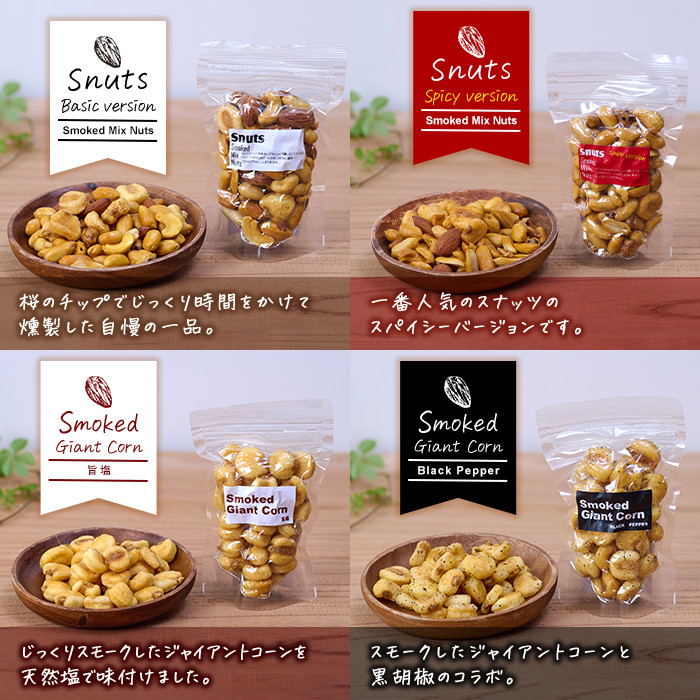 大人気Snuts他、スパイシーナッツなどの燻製ナッツをお任せでお届けします。