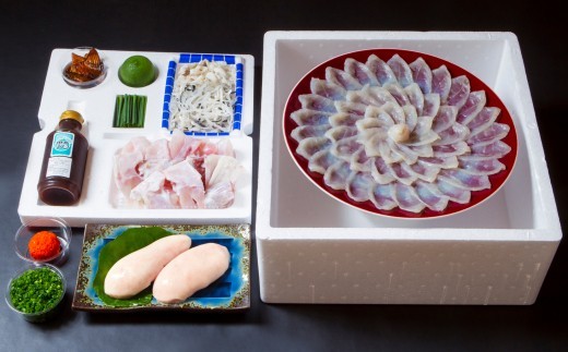 | 容量 | ・とらふぐ刺身(約185g) ・ふぐちり用とらふぐアラ(約400g) ・とらふぐ湯引き皮(約75g) ・とらふぐヒレ酒用焼きヒレ(3枚) ・野菜(白菜(約330g)、椎茸(約55g)、とうふ(約160g)、春菊(約50g)、白ねぎ(約85g)) ・ポン酢(250ml)×1本 ・だし昆布(1枚) ・薬味(小ネギ、もみじおろし) ・かぼす塩 ・割り箸×3本 ※本セットには、国産養殖とらふぐを使用しています。 |