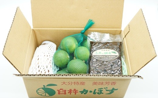 臼杵産カボスと、完熟トマトケチャップ、焼肉のたれ、ふきの佃煮の詰め合わせです。