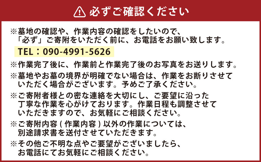 ※墓地の確認や、作業内容の確認をしたいので、「必ず」ご寄附をいただく前に、お電話をお願い致します。(TEL:090-4991-5626)