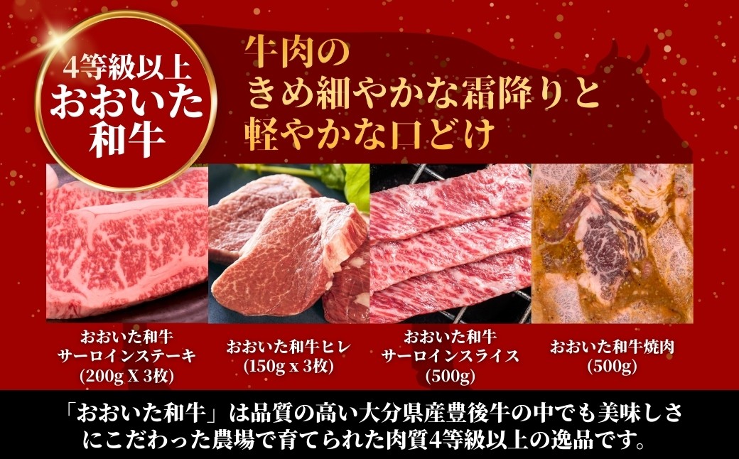| 容量 | 計6,050g ・おおいた和牛ヒレ(150g x 3枚) ・おおいた和牛サーロインスライス(500g) ・おおいた和牛焼肉(500g) ・冠地鶏モモ・ムネミックススライス(500g X 2P) ・おおいた和牛サーロインステーキ(200g X 3枚) ・大分県産豚切り落とし(500g X 6P) |