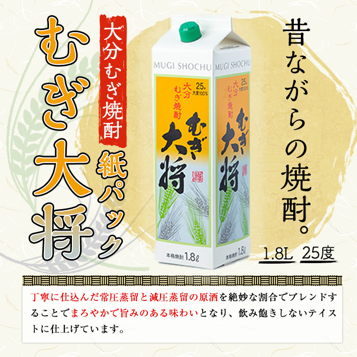 宇佐市で醸造した大分麦焼酎。食事のお供に最高な淡麗旨口タイプで大人気の商品です。 むぎ大将パック(計10.8L・1.8L×6本)大分むぎ焼酎 1800ml お酒 むぎ焼酎 麦焼酎 紙パック 常温【100100201】【縣屋酒造】