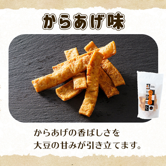 からあげ味は、からあげの香ばしさを大豆の甘みが引き立てる味。おつまみにもなります。
