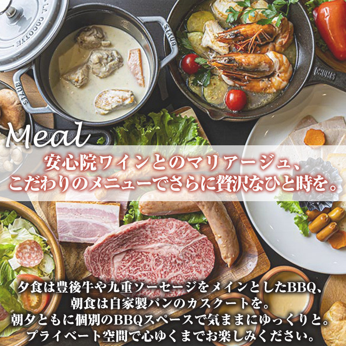 食事は運営するワイナリーレストランから安心院ワインに合うこだわりのお食事を。