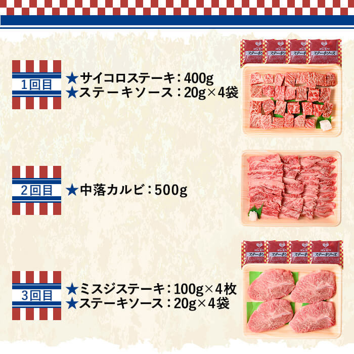 | 容量 | 【1回目】 ・サイコロステーキ:400g ・ステーキソース:20g×4袋 【2回目】 ・中落カルビ:500g 【3回目】 ・ミスジステーキ100g×4枚 ・ステーキソース:20g×4袋 全3回(隔月) |