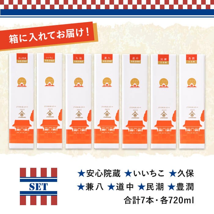 | 容量 | 宇佐の7蔵(三和酒類、小松酒造場、民潮酒舗、久保酒造、常徳屋酒造、縣屋酒造、四谷酒造)の地酒 720ml×7本 ・安心院蔵 ・いいちこ ・兼八 ・久保 ・道中 ・豊潤 ・民潮 |