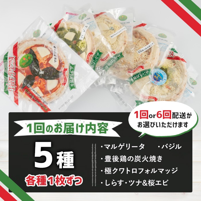 | 容量 | ▼1回のお届け内容 ・マルゲリータ:1枚 ・バジル:1枚 ・極クワトロフォルマッジ:1枚 ・豊後鶏の炭火焼き:1枚 ・しらす・ツナ&桜エビ:1枚 1回 or 6回(毎月)配送がお選びいただけます |