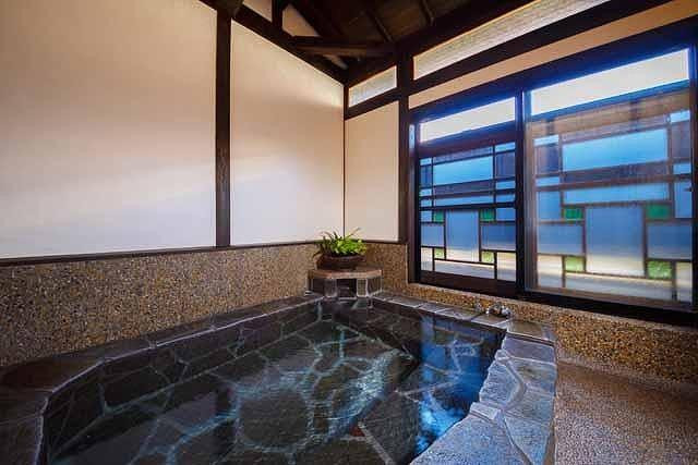 源泉かけ流しの岩風呂。泉質はミネラル分を豊富に含むことで傷の治癒を促進することに加え入れば入るほどにつるつるのお肌を手に入れることができる美容効果の高いお湯で貸切でゆっくりとお楽しみいただくことができます。