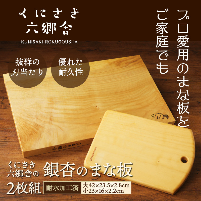 ※卓越した技術でアート性と実用性を兼ね備えた木工商品を製作する「くにさき六郷舎」。本商品は、大分県産の銀杏(イチョウ)で作ったまな板(大・小)の2枚組セット。耐水加工をしっかり施し、水に強く、汚れにくく、丈夫に仕上げました。刃当りも抜群で、その使い易さはまさにプロ仕様です。小サイズのまな板は、卓上用としても使えるお洒落なデザインとなっています。