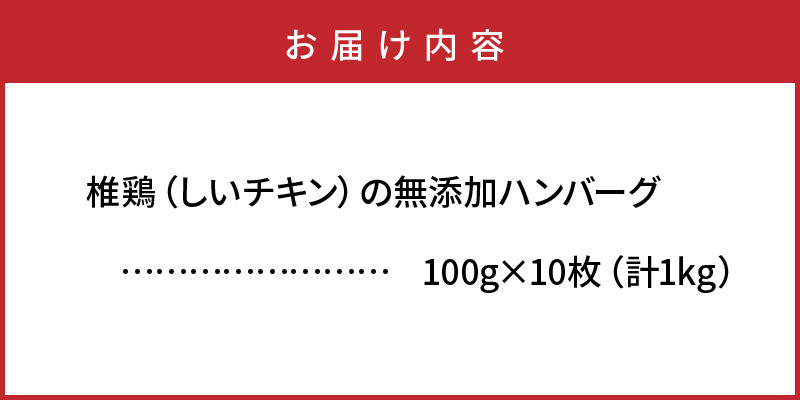 商品内容:椎鶏(しいチキン)の無添加ハンバーグ100g×10枚(計1kg)