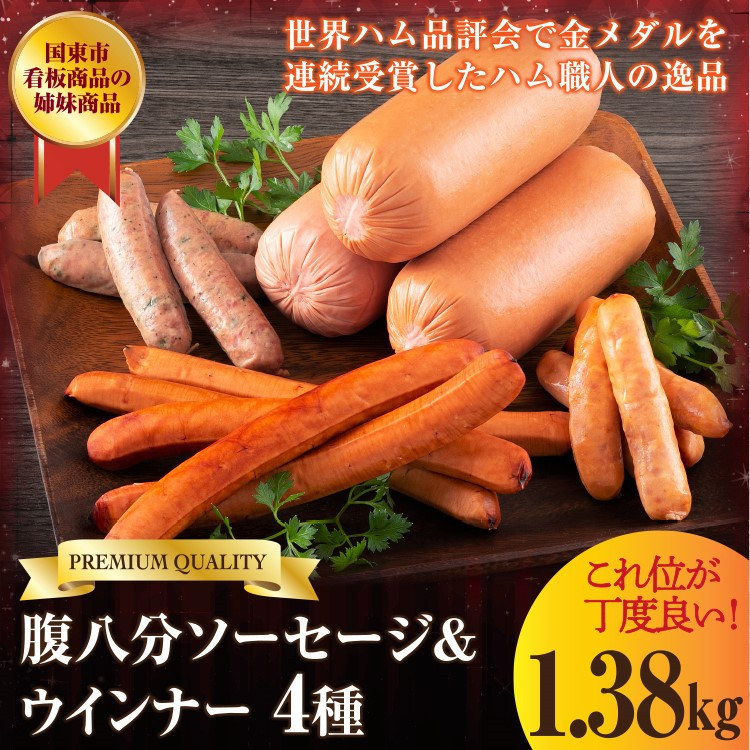 ※国東市の看板商品「お腹いっぱいソーセージ&ウインナーの盛り盛り2キロ越え!」の姉妹商品がついに登場!厳選した大分県産豚肉で作った4種のソーセージとウインナーの詰合せを1.38kgお届けします!「腹八分」と名付けていますが、全部食べるとお腹いっぱいになりますのでご注意下さい!世界ハム品評会で金メダルを何度も受賞した、こだわりのハム職人が作った逸品で味も折り紙付きです。 ※画像はイメージです。