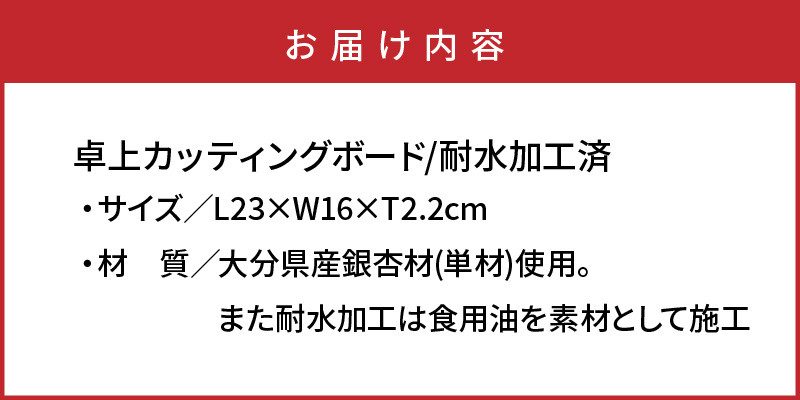 | 容量 | 卓上カッティングボード(サイズ)L23×W16×T2.2cm/耐水加工済 ※大分県産銀杏材(単材)使用。また耐水加工は食用油を素材として施工 |