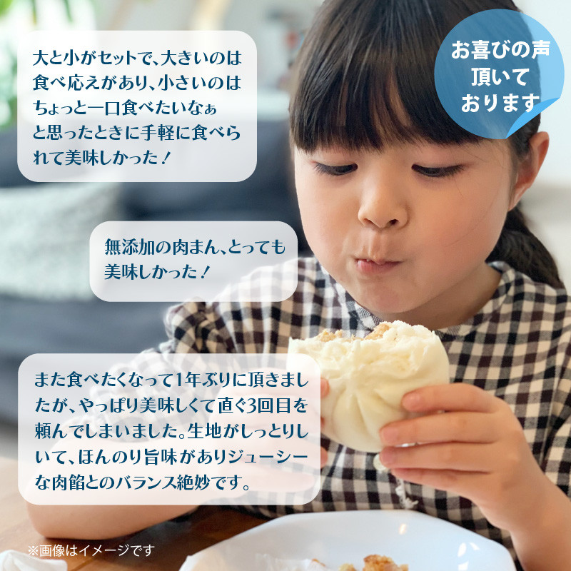 ※国東の豚まん職人が手作りする豚まん。もちもち食感のこだわり生地に豚肉・玉ねぎを特製のタレで味付けした餡を、ひとつひとつ丁寧に包み込みました。一口食べると豚肉の旨味と玉ねぎの甘味が口いっぱいに広がっていきます。本品は食べ応え抜群の特大サイズと食べやすいミニサイズのセットとなっております。