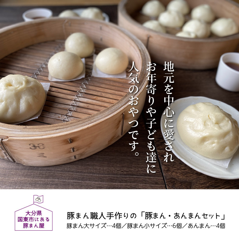 ※国東の豚まん職人が手作りする豚まん。もちもち食感のこだわり生地に豚肉・玉ねぎを特製のタレで味付けした餡を、ひとつひとつ丁寧に包み込みました。一口食べると豚肉の旨味と玉ねぎの甘味が口いっぱいに広がっていきます。本品は食べ応え抜群の特大サイズと食べやすいミニサイズ、さらに甘~いあんまんをセットにしてお届けします。