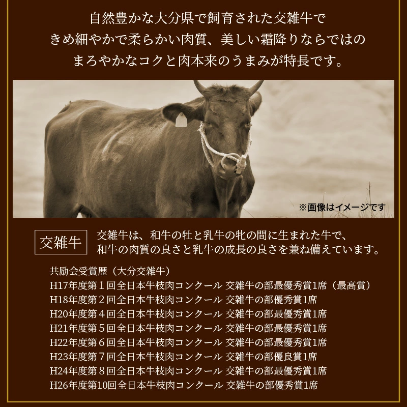 おおいた豊美牛は、自然豊かな大分県で飼育された交雑牛できめ細やかな肉質、美しい霜降りならではのまろやかなコクと肉本来のうまみが特長で、全国コンクールの交雑牛部門で数々の賞に輝いています。