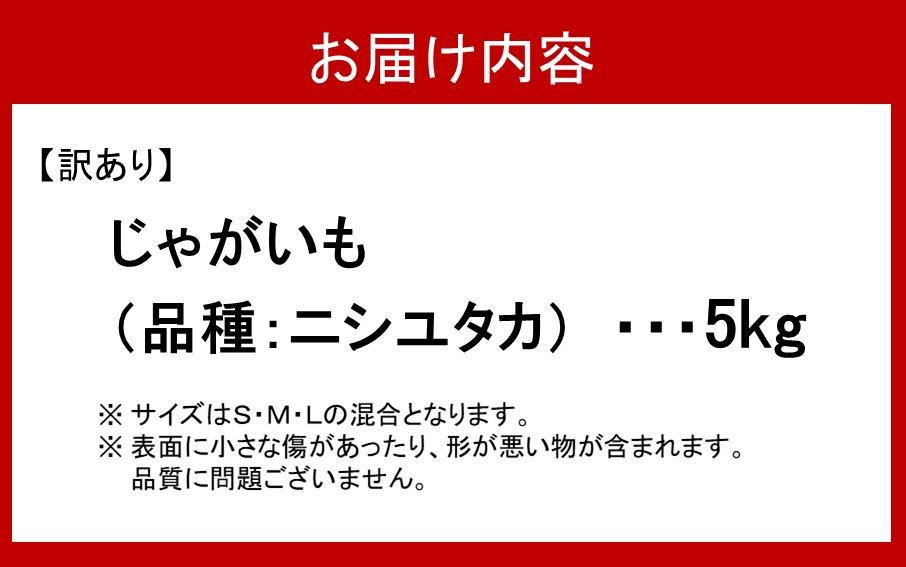 | 容量 | じゃがいも5kg(品種:ニシユタカ) ※サイズはS・M・Lの混合となります。サイズはご指定いただけません。 ※出荷前にはふき取りをおこなっていますが、多少土がついた状態での出荷となります。ご了承ください。 ※表面に小さな傷があったり、形が悪い物が含まれます。品質に問題ございません。 |