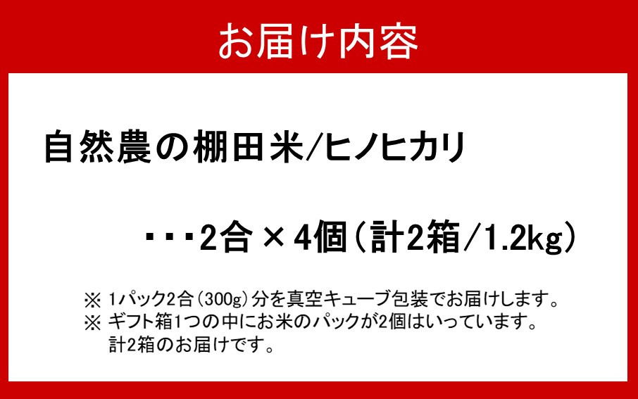 栽培期間中農薬・化学肥料不使用 いのち豊かな棚田で丁寧に栽培した自慢のお米 ギフト用/自然農の掛け干し棚田米 ヒノヒカリ 真空キューブ 2合×4個(2箱)_2352R
