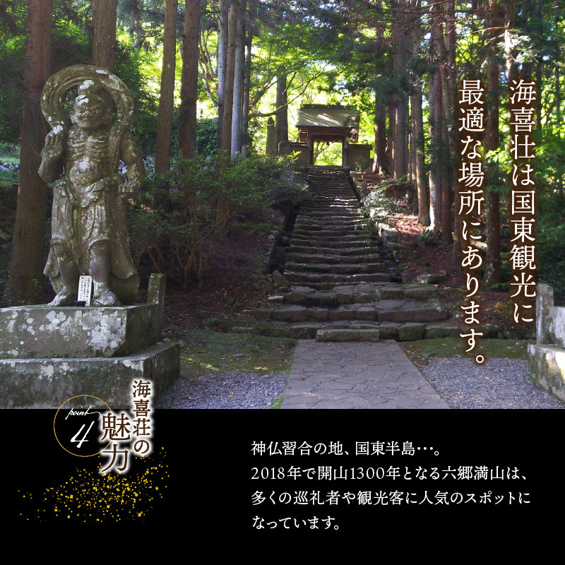 ※自然の恵みあふれる大分県国東半島。海喜荘(かいきそう)は、大正11年の創業以来、国東半島でとれる素晴らしい食材を使った料理をはじめ、温かいおもてなしをご提供する老舗割烹旅館です。遠浅の広い海の静けさに包まれた風景、大正の浪漫溢れる癒しの客室、そして最高の郷土料理で、日常の喧騒から離れ、ゆっくりとお過ごしください。