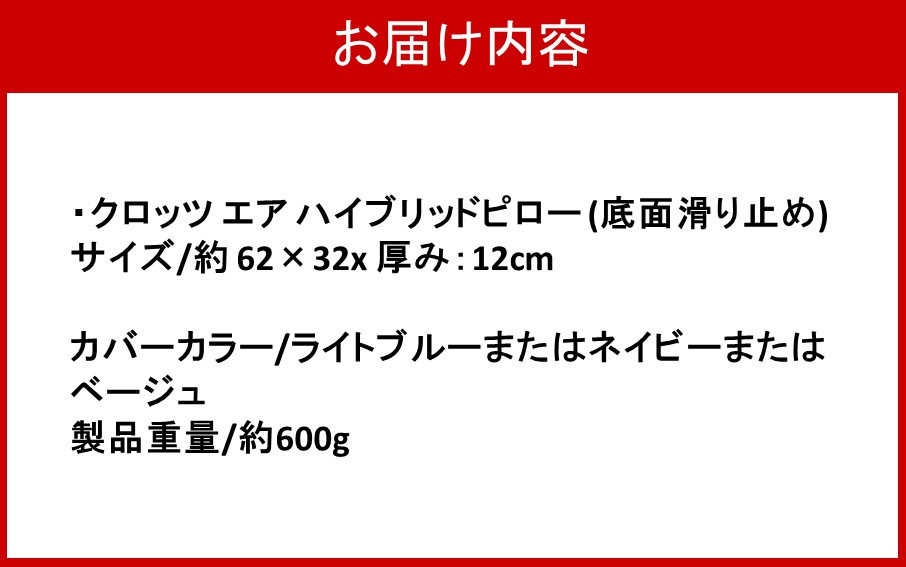 | 容量 | ・クロッツ エア ハイブリッドピロー (底面滑り止め) ※お申込み時にカラーをお選びください。 カバーカラー/ライトブルー または ネイビー または ベージュ サイズ/約 62×32x 厚み:12cm 製品重量/約600g |