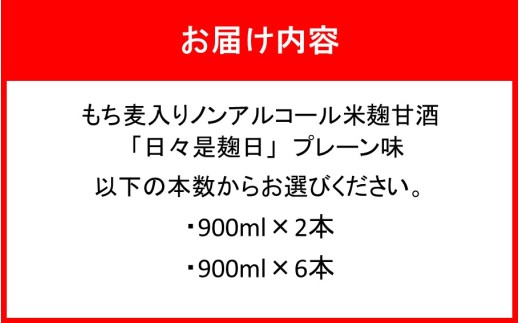 容量 | 国東産米100%使用 もち麦入りノンアルコール米麹甘酒「日々是麹日」 プレーン味 ・900ml×2本 ・900ml×6本 |