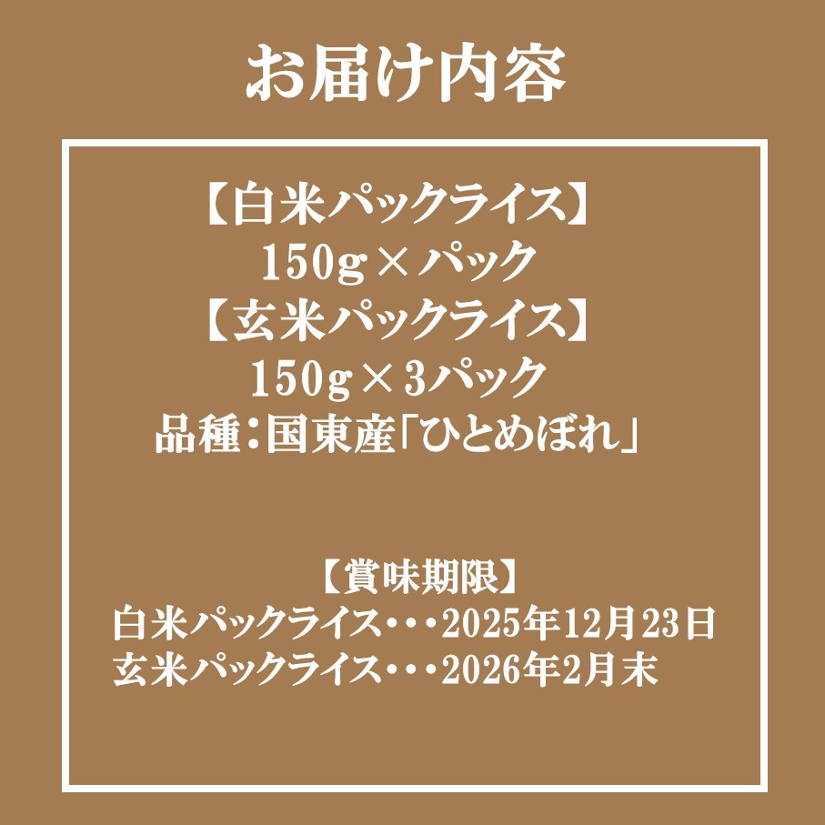 | 容量 | 国東産「ひとめぼれ」 白米パックライス 150g×3P 玄米パックライス 150g×3P |