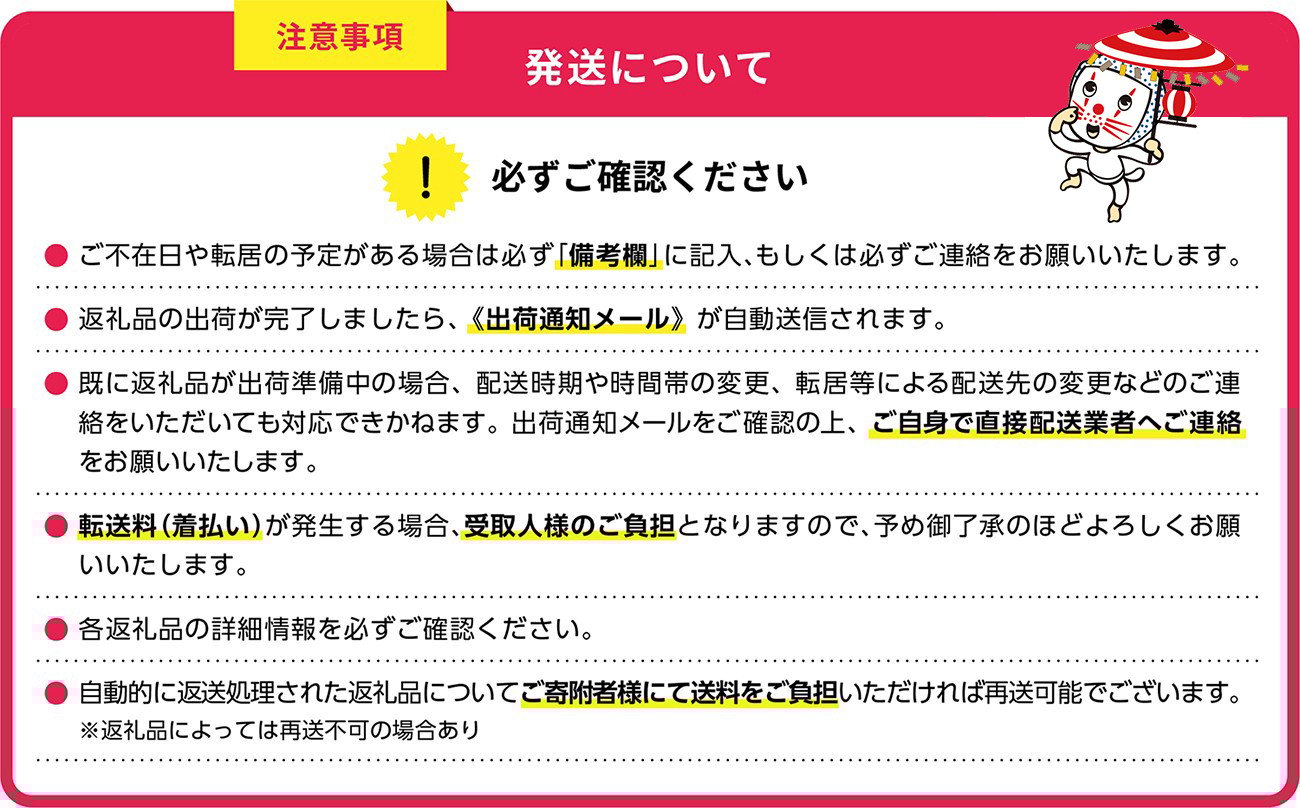 入金確認後、お申込み順に発送予定 ※原料調達による遅延が発生する場合がございますので、ご了承の上お申し込みください。 ※年末年始など、ご注文が殺到した場合には発送までお時間をいただく場合がございます。 ※着日・着曜日指定不可(時間帯のみ指定可) ※不在日は必ず備考欄に入力、あるいは直接メールにてご連絡ください。 |