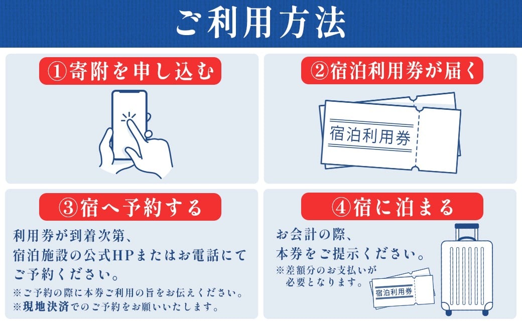 入金確認後、お申込み順に発送予定 ※発送までお時間をいただく場合がございます。 ※郵送にてお届けのため、配達指定日・時間帯不可 <ご利用方法> ①寄附を申し込む ②本券が届く ③宿へ予約する 利用券が到着次第、宿泊施設の公式HPまたはお電話にてご予約ください。 ※ご予約の際に本券ご利用の旨をお伝えください。 ※現地決済でのご予約をお願いいたします。 ④宿に泊まる お会計の際、本券をご提示ください。差額分のお支払いが必要となります。 |