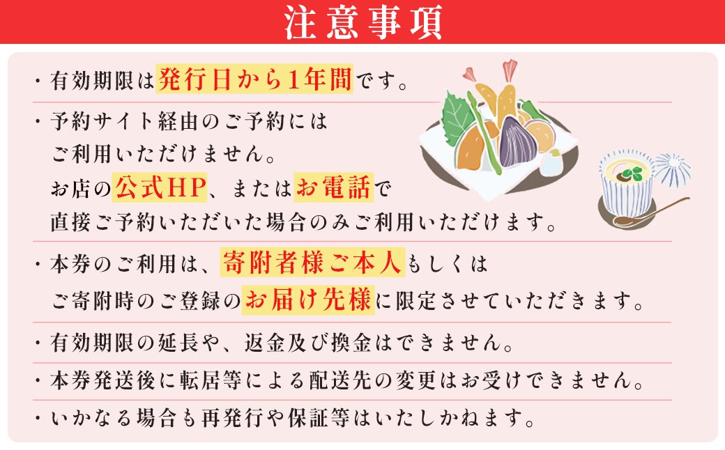 入金確認後、お申込み順に発送予定 ※発送までお時間をいただく場合がございます。 ※郵送にてお届けのため、配達指定日・時間帯不可 <ご利用方法> ①寄附を申し込む ②本券が届く ③お店へ予約する 本券が到着次第、お店の公式HPまたはお電話にてご予約ください。 ※不定休のため必ずご予約の上ご来店ください。 ※ご予約の際に本券ご利用の旨をお伝えください。 ④お店に行く お会計の際、本券をご提示ください。差額分のお支払いが必要となります。 |