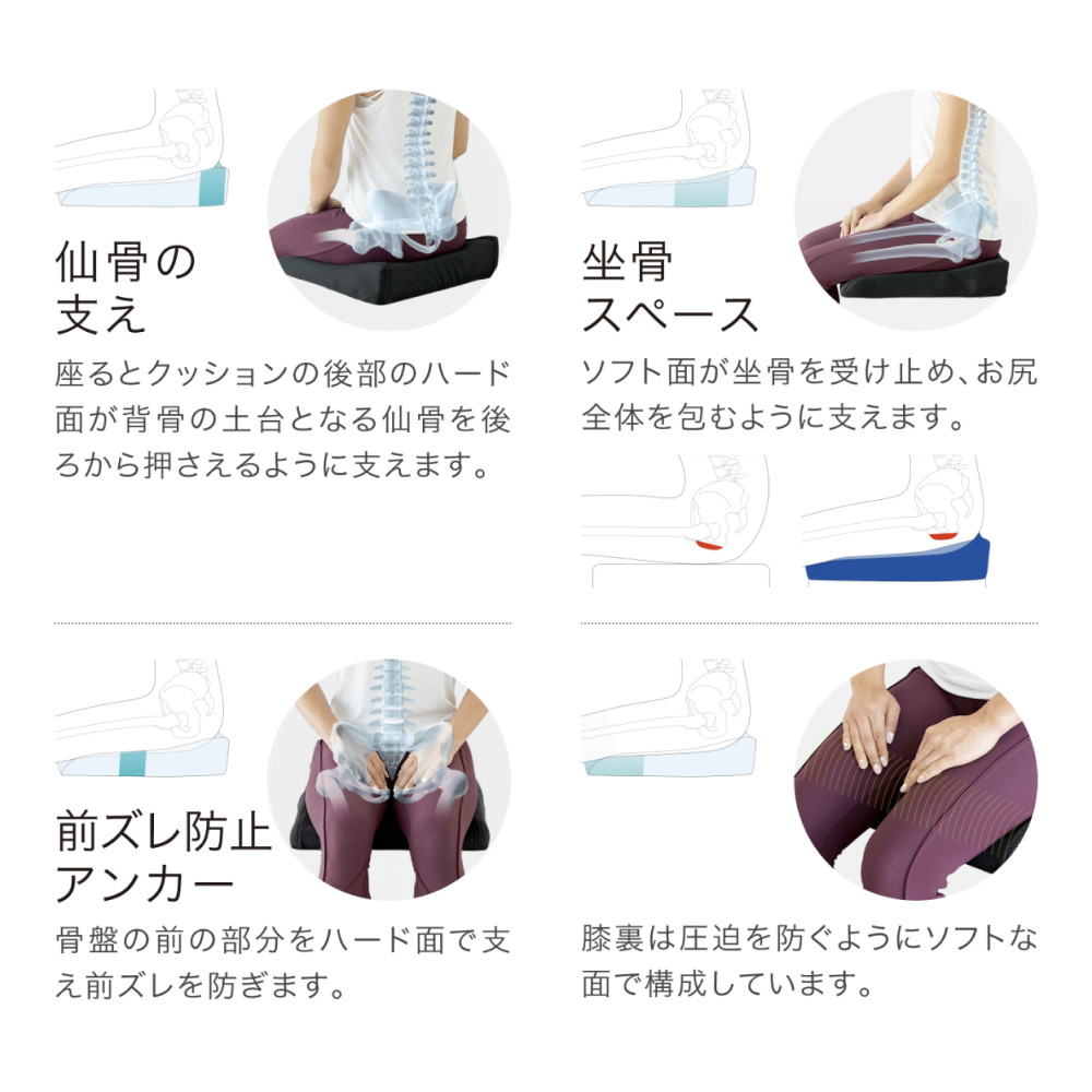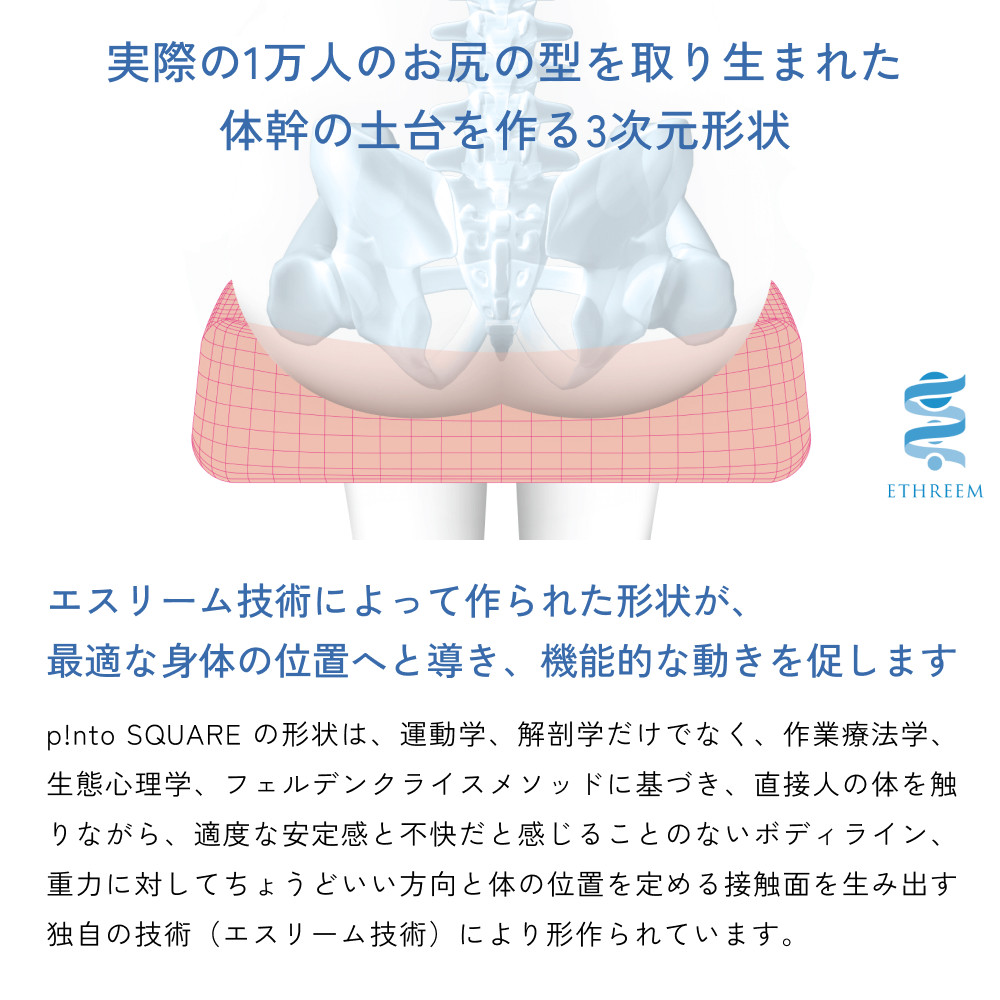 pintoシリーズの中で弾力があり柔らかい製品になっています。仙骨、坐骨、足を効果的な柔らかさで支え快適姿勢をサポートします。