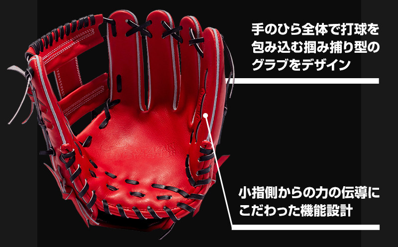 小指側からの力の伝導にこだわった機能設計で、手のひら全体で打球を包み込むような理想的な“掴み捕り型”のグラブをデザインしました。